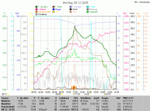 Montag, am 08.12. hatten wir eine durchschnittliche Temperatur von 13.5°C. Damit war es der zweitwärmste Dezembertag für unsere Station und gut 10°C zu warm für einen Dezember. Nur Silvester 2022 war nochmal extremer.
