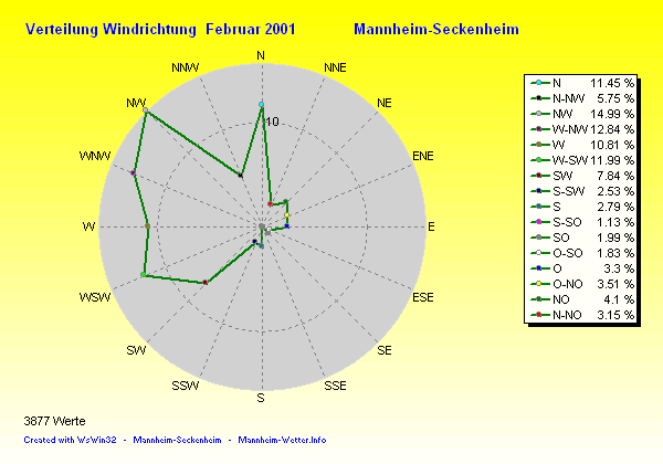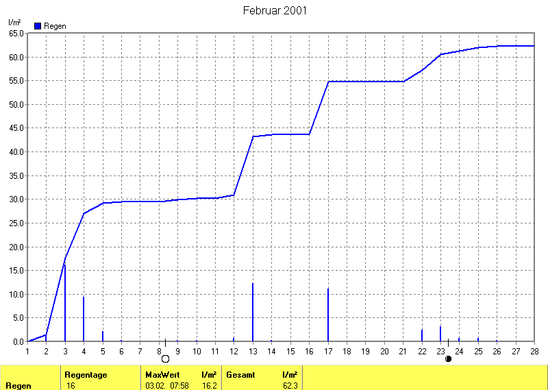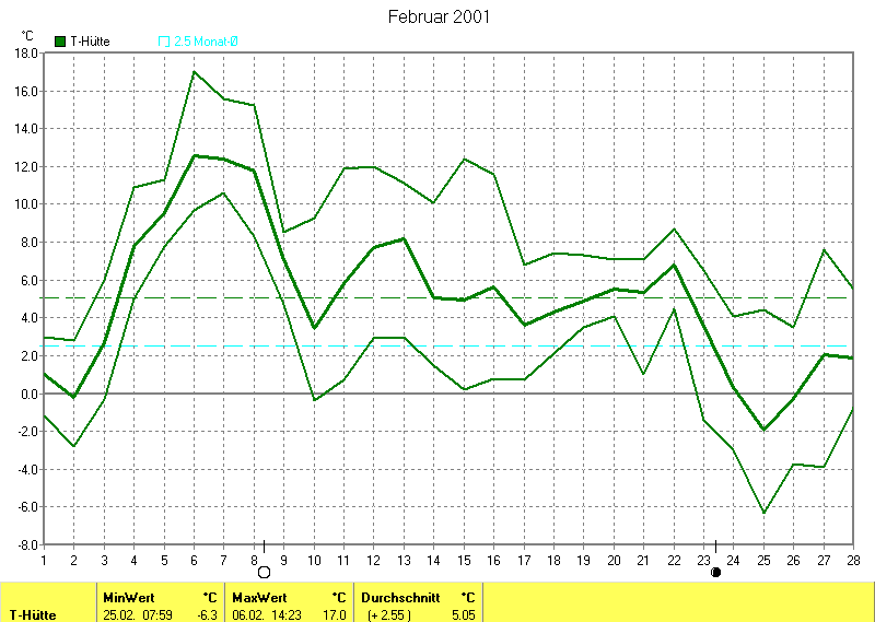 Der wärmste Tag war der 06.02.2001 um 14:23 mit 17.0°C. Am kältesten war es mit -6.3°C am 25.02.2001 um 07:59.