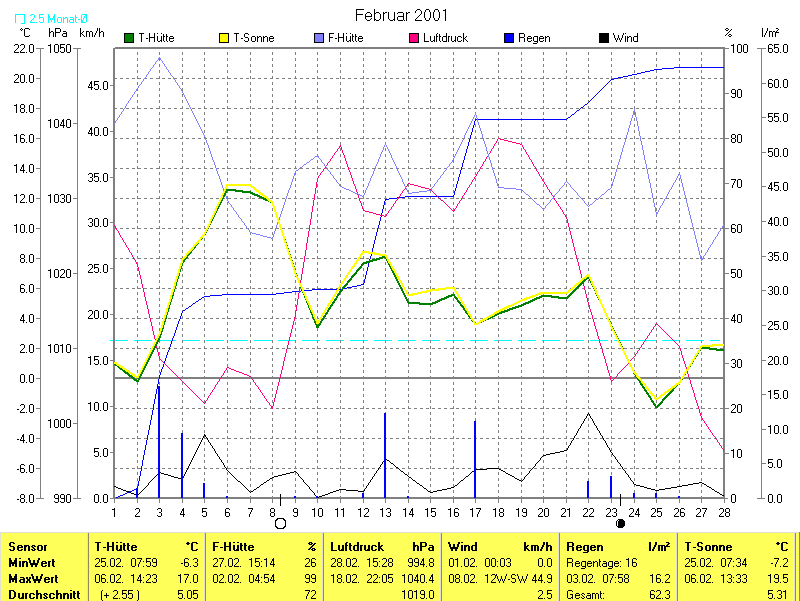 Die Durchschnittstemperatur für den Monat Februar 2001 lag bei 5.05°C. Die Abweichung vom langjährigen Mittel war +2.55°C.