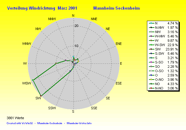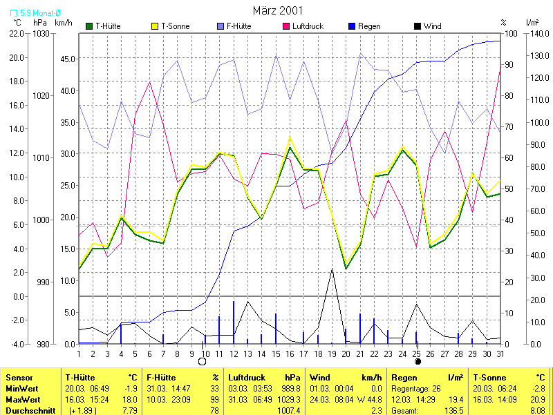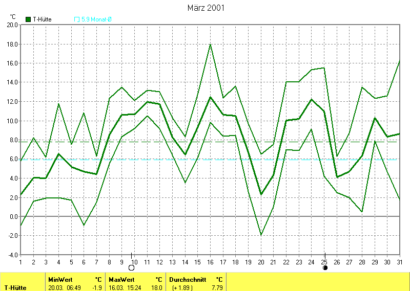 Der wärmste Tag war der 16.03.2001 um 15:24 mit 18.0°C. Am kältesten war es mit -1.9°C am 20.03.2001 um 06:49.