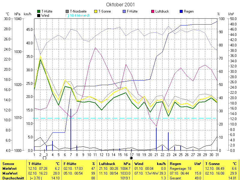 Die Durchschnittstemperatur für den Monat Oktober 2001 lag bei 14.10°C. Die Abweichung vom langjährigen Mittel war +3.70°C.