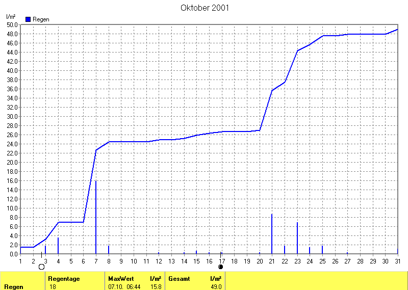 Dargestellt wird die grafische Übersicht für den Niederschlag. Zu sehen sind immer die täglichen Niederschlagsmengen (von 0-24 Uhr) und in der ansteigenden Linie die Summe aller Niederschläge:
