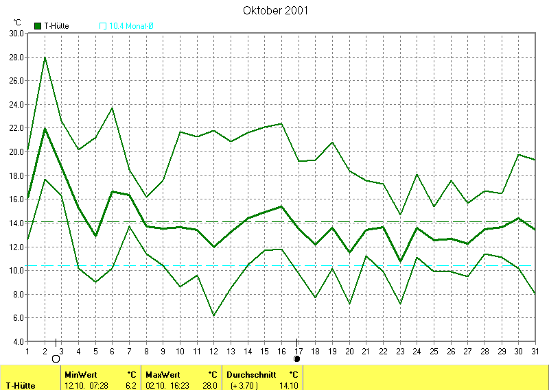 Der wärmste Tag war der 02.10.2001 um 16:23 mit 28.0°C. Am kältesten war es mit 6.2°C am 12.10.2001 um 07:28.