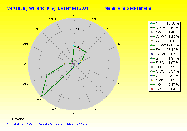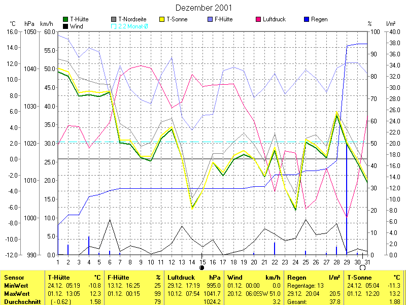 Der wärmste Tag war der 01.12.2001 um 13:05 mit 12.3°C. Am kältesten war es mit -10.8°C am 24.12.2001 um 05:19.