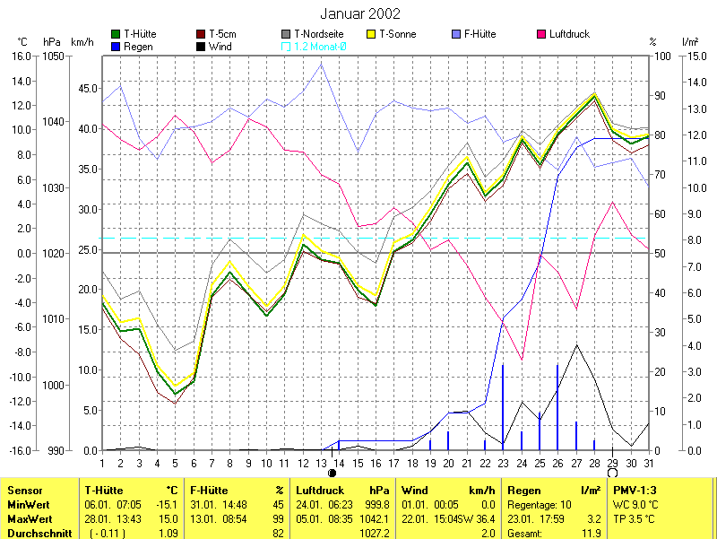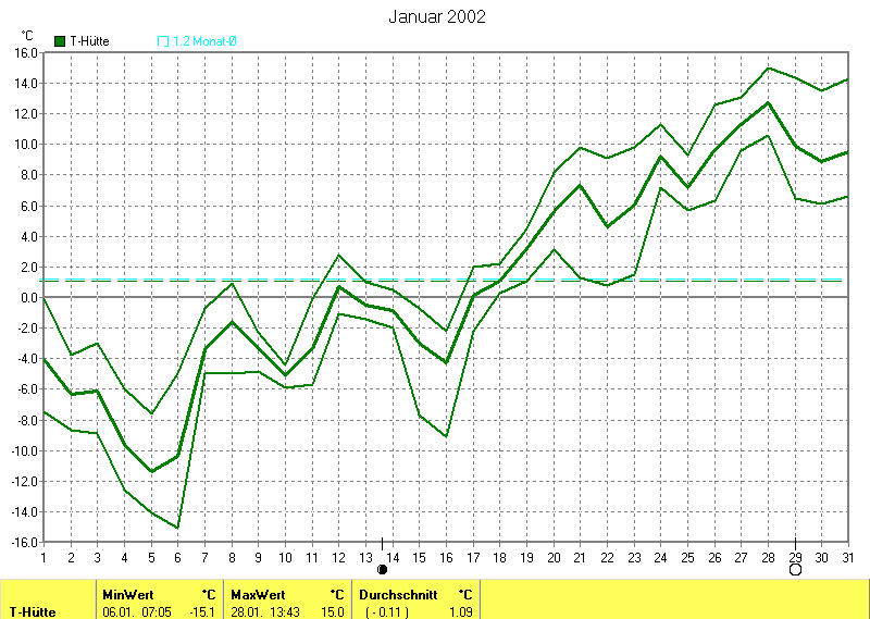 Der wärmste Tag war der 28.01.2002 um 13:43 mit 15.0°C. Am kältesten war es mit -15.1°C am 06.01.2002 um 07:05.