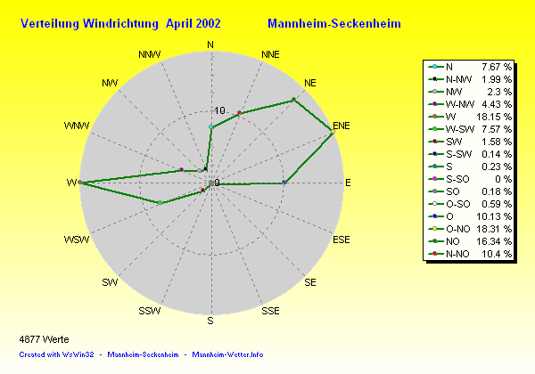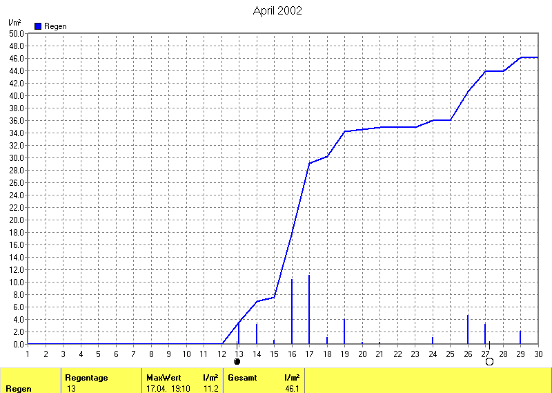 Die Durchschnittstemperatur für den Monat April 2002 lag bei 11.03°C. Die Abweichung vom langjährigen Mittel war +1.13°C.