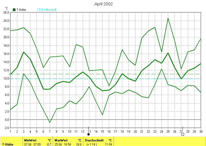 Der wärmste Tag war der 25.04.2002 um 16:54 mit 24.6°C. Am kältesten war es mit -0.7°C am 07.04.2002 um 07:09.