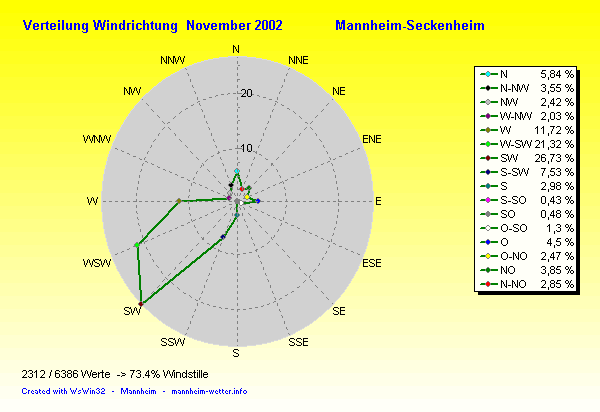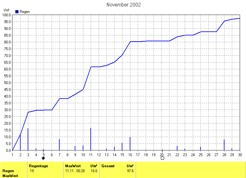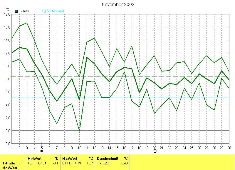 Der wärmste Tag war der 03.11.2002 um 14:19 mit 16.7°C. Am kältesten war es mit -0.1°C am 10.11.2002 um 07:34.