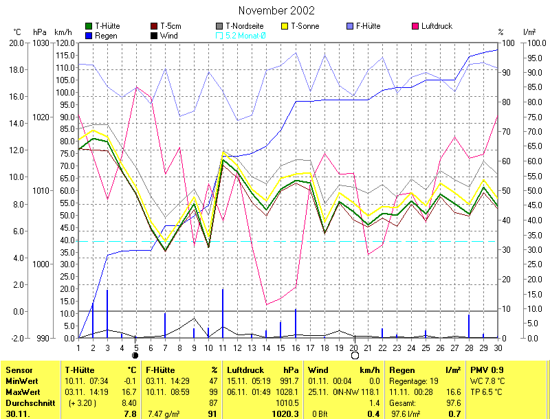 Die Durchschnittstemperatur für den Monat November 2002 lag bei 8.40°C. Die Abweichung vom langjährigen Mittel war +3.20°C.