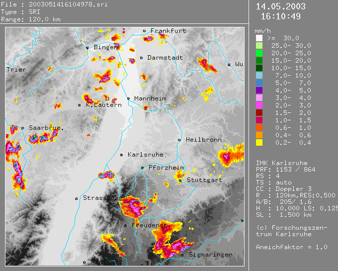 Ein Gewitter mit Graupel (Hagel?) über Ludwigshafen und den Süden von Mannheim: