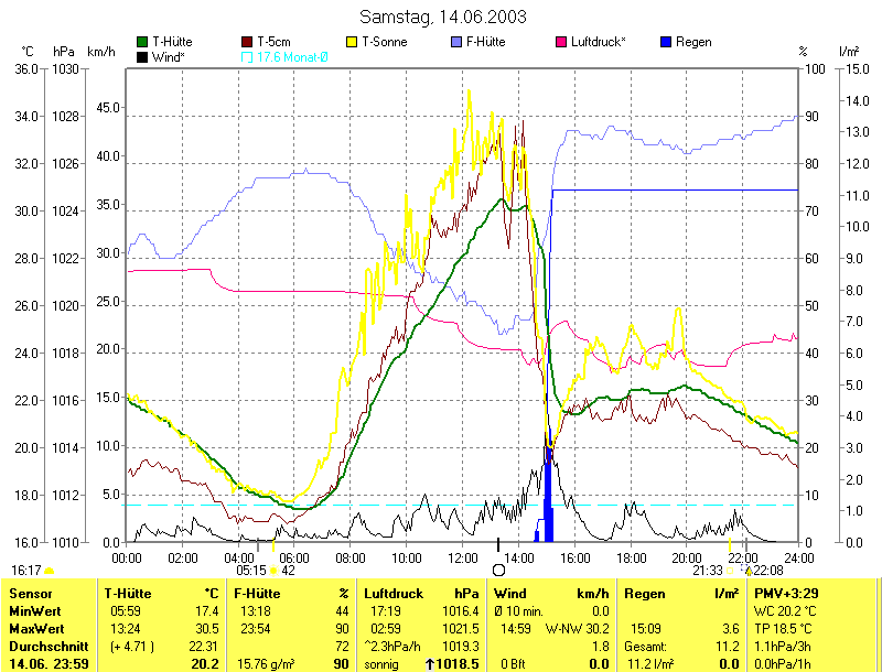 Die Grafik zeigt u.a. den Temperaturverlauf und die Regenmenge: