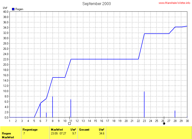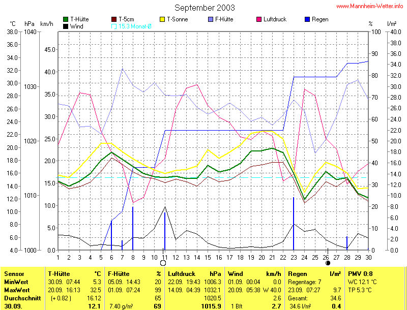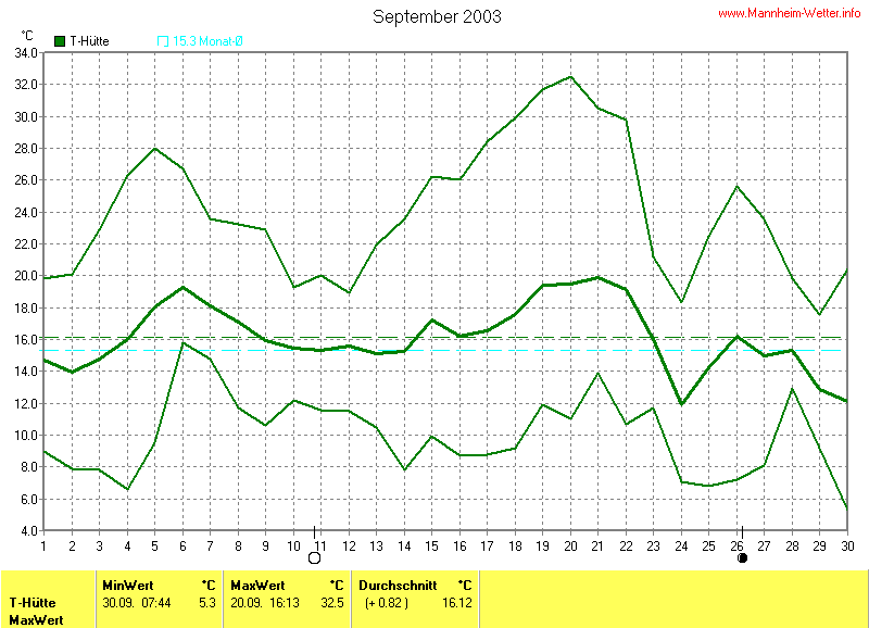 Der wärmste Tag war der 20.09.2003 um 16:13 mit 32.5°C. Am kältesten war es mit 5.3°C am 30.09.2003 um 07:44.