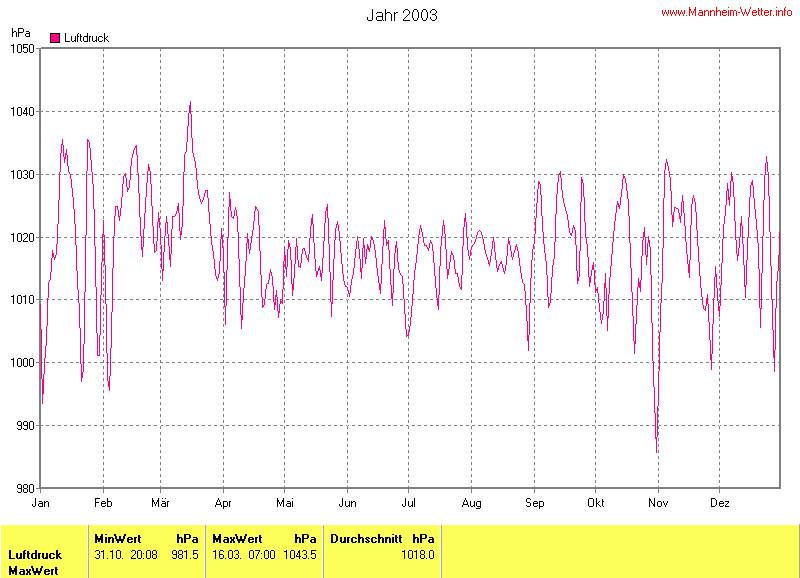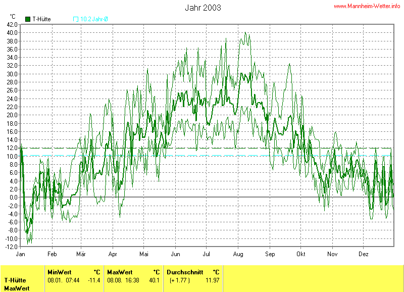 Die Durchschnittstemperatur für das Jahr 2003 lag bei 11.97°C. Die Abweichung vom langjährigen Mittel war +1.77°C.