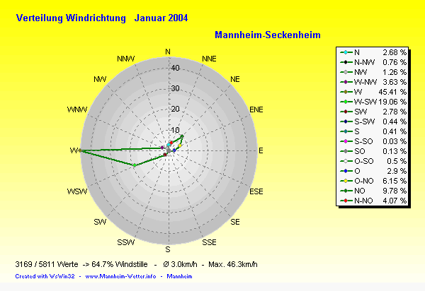 Der wärmste Tag war der 13.01.2004 um 13:44 mit 11.4°C. Am kältesten war es mit -6.4°C am 03.01.2004 um 05:13.
