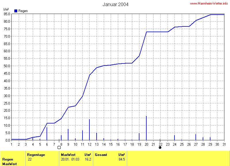 Dargestellt wird die grafische Übersicht für den Niederschlag. Zu sehen sind immer die täglichen Niederschlagsmengen (von 0-24 Uhr) und in der ansteigenden Linie die Summe aller Niederschläge: