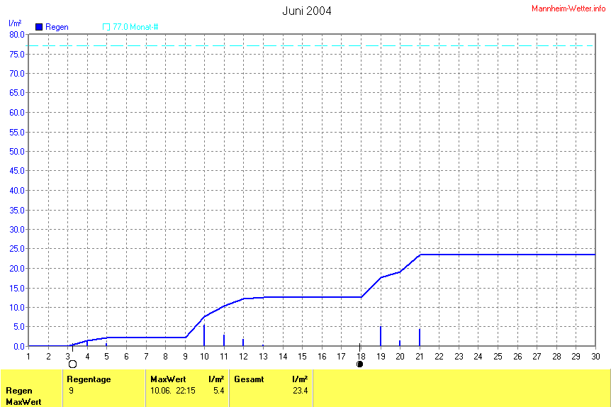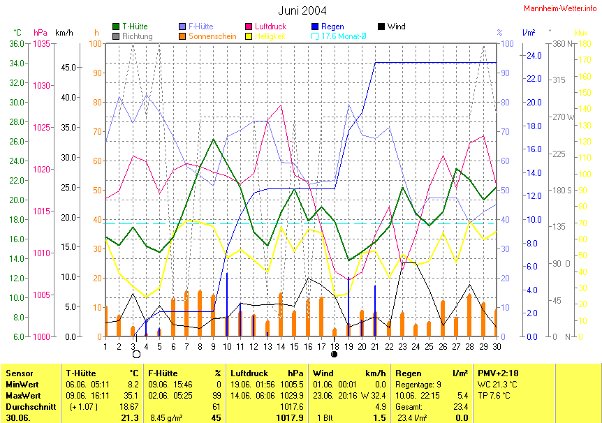Die Durchschnittstemperatur für den Monat Juni 2004 lag bei 18.67°C. Die Abweichung vom langjährigen Mittel war +1.07°C.