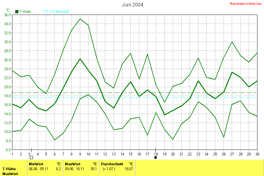 Der wärmste Tag war der 09.06.2004 um 16:11 mit 35.1°C. Am kältesten war es mit 8.2°C am 06.06.2004 um 05:11.
