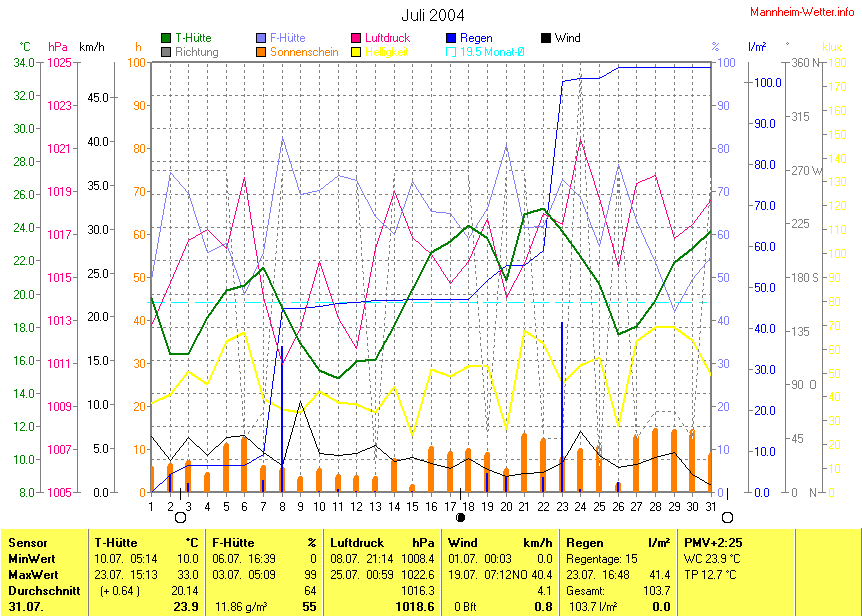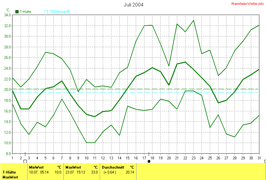 Der wärmste Tag war der 23.07.2004 um 15:13 mit 33.0°C. Am kältesten war es mit 10.0°C am 10.07.2004 um 05:14.