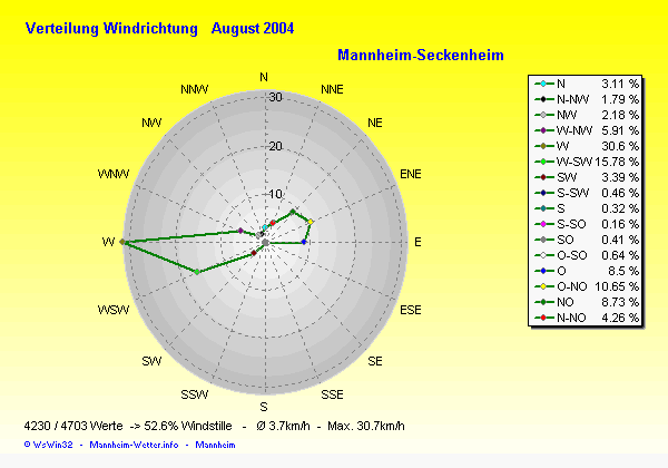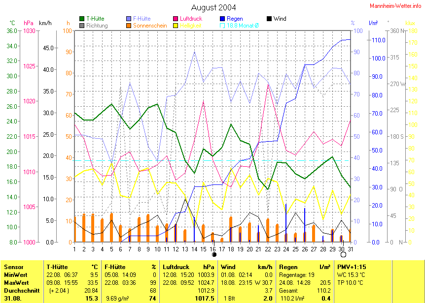 Der wärmste Tag war der 09.08.2004 um 15:55 mit 33.5°C. Am kältesten war es mit 9.5°C am 22.08.2004 um 06:37.