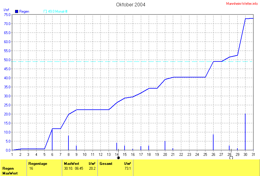 Die gesamte Regenmenge lag bei 73.1l/m² (entspricht: 149.1%) und war damit um +24.1l/m² vom langjährigen Wert entfernt. Niederschlag gab es an 16Tagen. Mehr als 2mm Regen gab es an 11Tagen. Sehr viel Regen mit mehr als 20mm pro Tag gab es an 1Tagen.