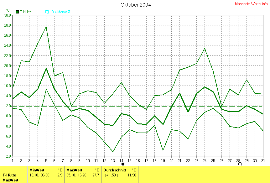 Der wärmste Tag war der 05.10.2004 um 16:20 mit 27.7°C. Am kältesten war es mit 2.9°C am 13.10.2004 um 06:00.