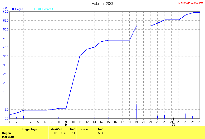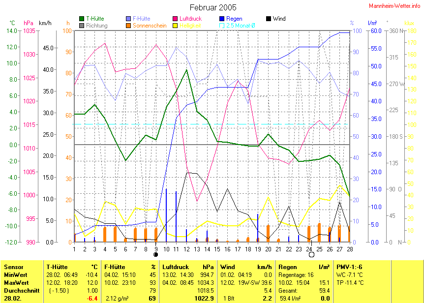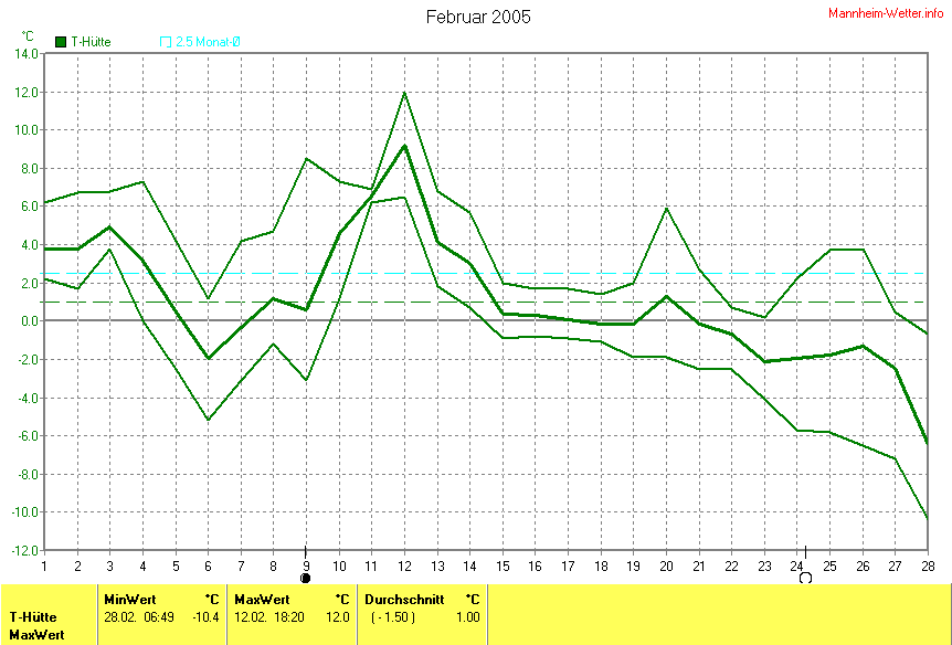 Der wärmste Tag war der 12.02.2005 um 18:20 mit 12.0°C. Am kältesten war es mit -10.4°C am 28.02.2005 um 06:49.
