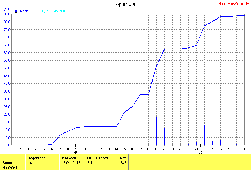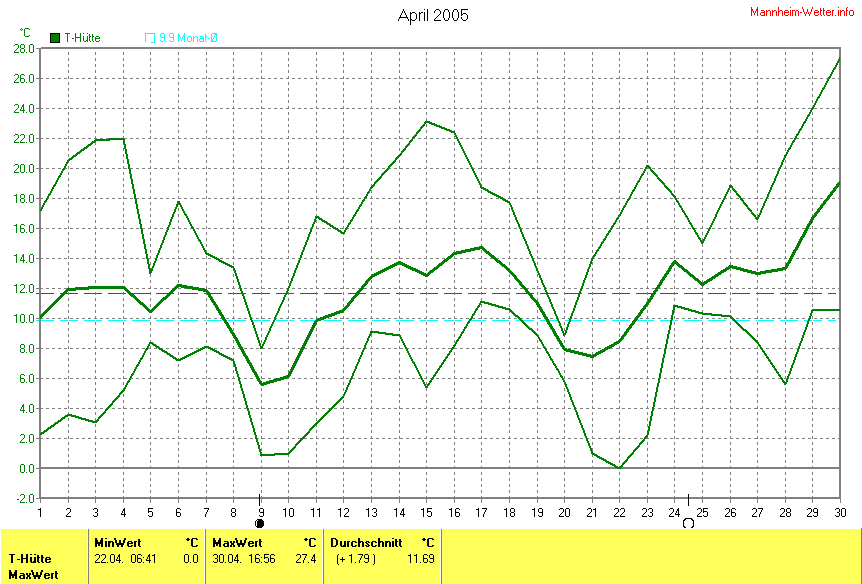 Der wärmste Tag war der 30.04.2005 um 16:56 mit 27.4°C. Am kältesten war es mit 0.0°C am 22.04.2005 um 06:41.