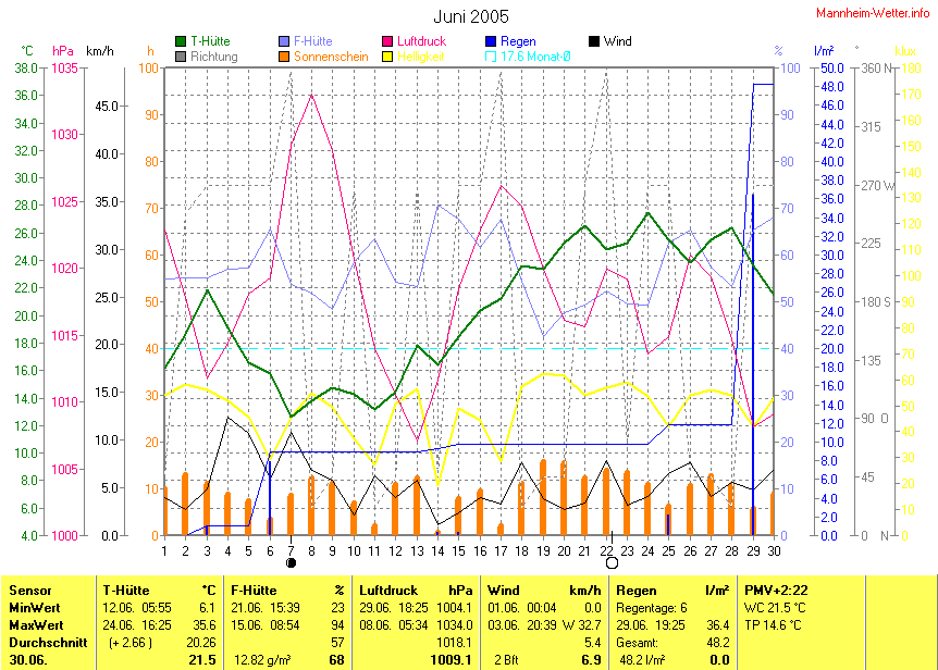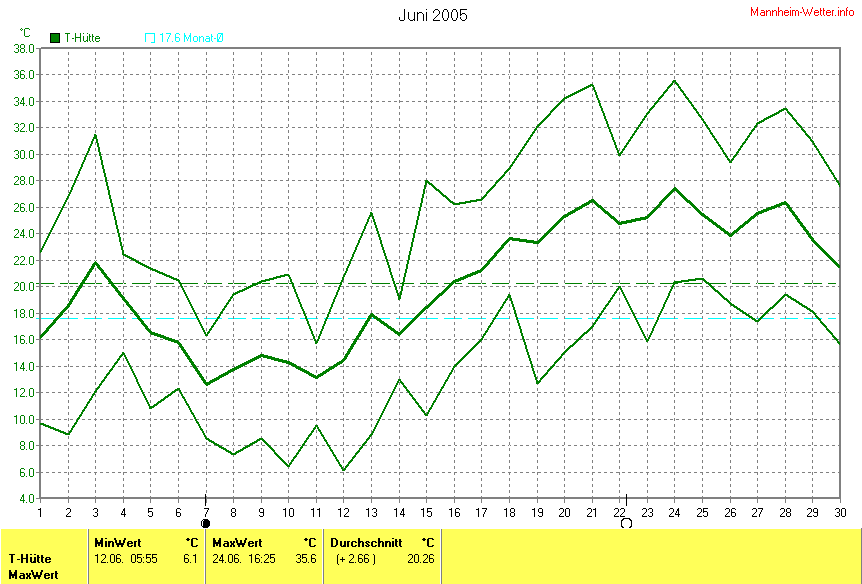 Der wärmste Tag war der 24.06.2005 um 16:25 mit 35.6°C. Am kältesten war es mit 6.1°C am 12.06.2005 um 05:55.