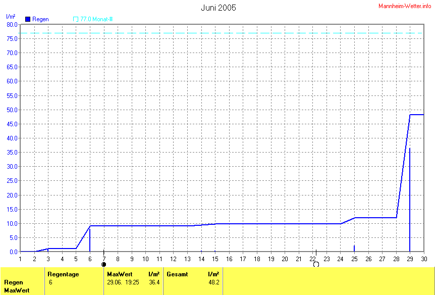 Die gesamte Regenmenge lag bei 48.2l/m² (entspricht: 62.6%) und war damit um -28.8l/m² vom langjährigen Wert entfernt. Niederschlag gab es an 6Tagen. Mehr als 2mm Regen gab es an 3Tagen. Sehr viel Regen mit mehr als 20mm pro Tag gab es an 1Tagen.