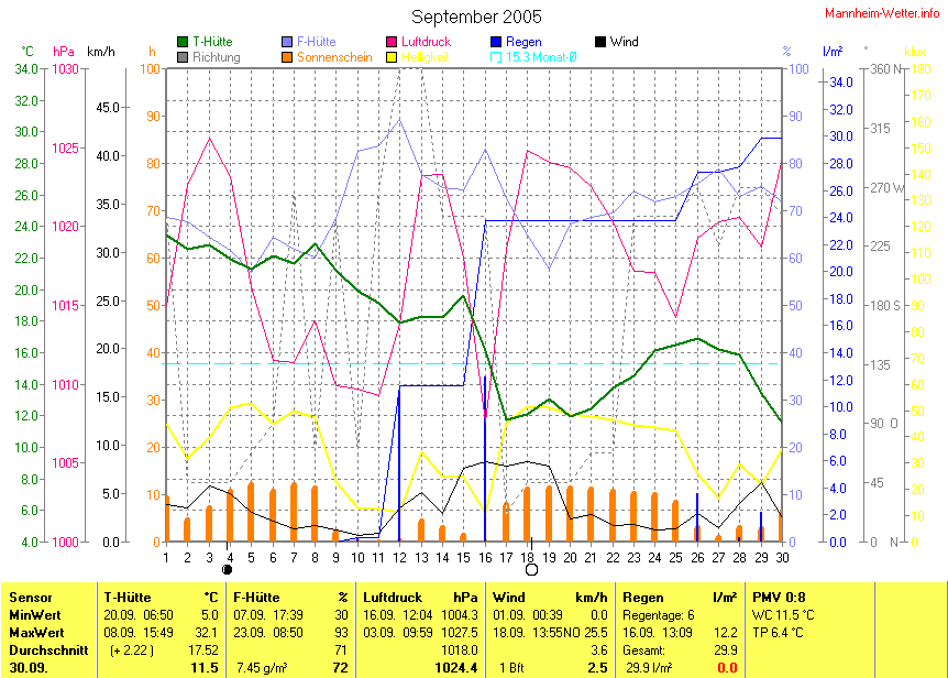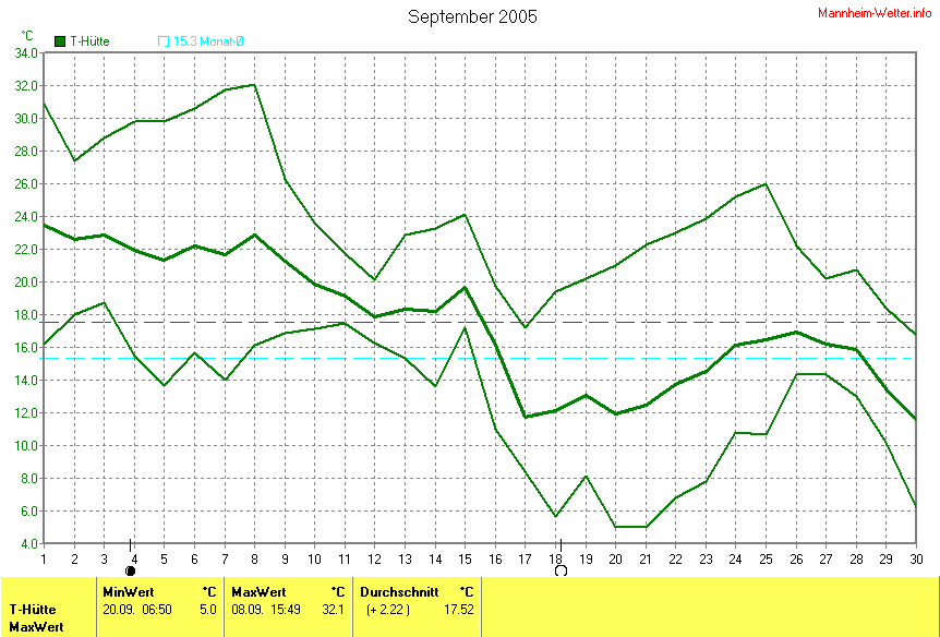 Der wärmste Tag war der 08.09.2005 um 15:49 mit 32.1°C. Am kältesten war es mit 5.0°C am 20.09.2005 um 06:50.