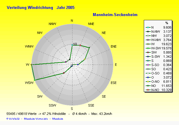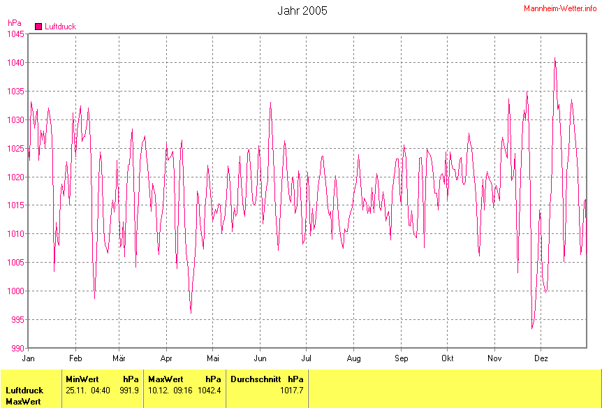 Am wärmsten war es am 28.07.2005 um 16:46 mit 36.7°C. Am kältesten mit -11.6°C am 01.03.2005 um 06:00.
