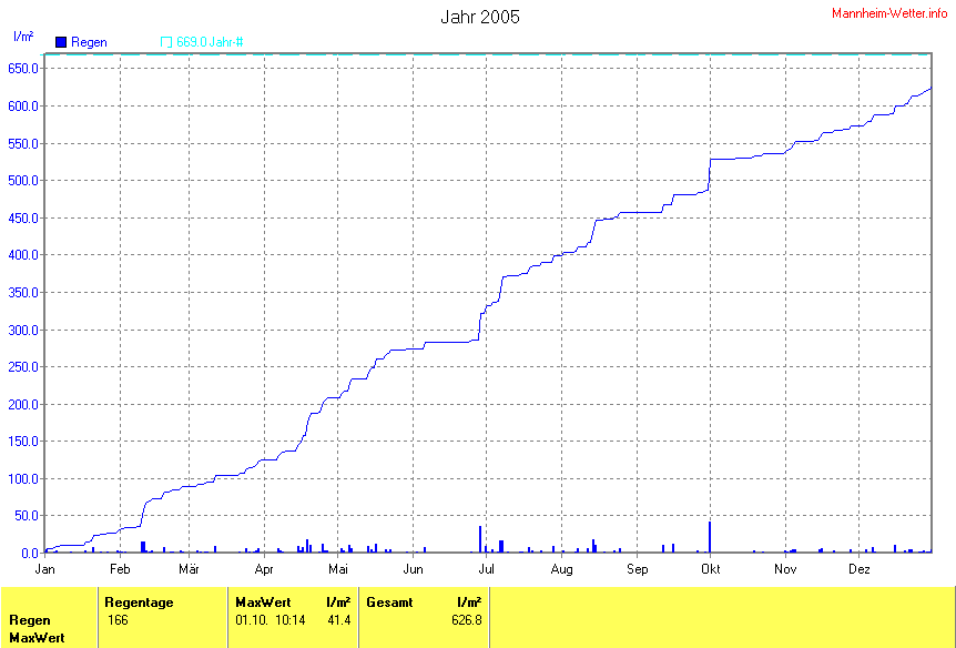 Die gesamte Regenmenge lag bei 626.8l/m² ( 93.7%) und war damit um -42.2l/m² vom langjährigen Wert entfernt. Niederschlag gab es an 166Tagen. Mehr als 2mm Regen gab es an 80Tagen. Sehr viel Regen mit mehr als 20mm pro Tag gab es an 2Tagen.