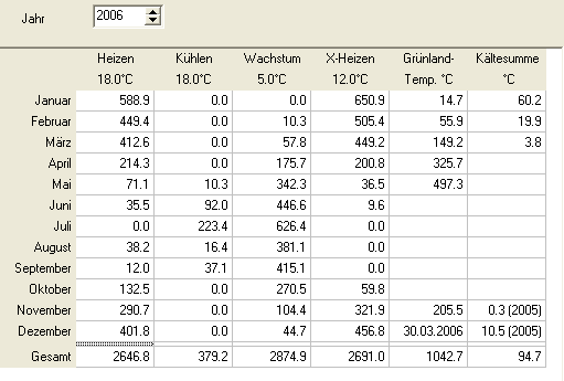 | Berechnung: Liegt der Temperatur-Mittelwert des Tages über dem einstellbaren Basiswert (5°C) wird die Differenz vom aktuellen Mittelwert zum Basiswert zu den Wachstumsgradtagen addiert.