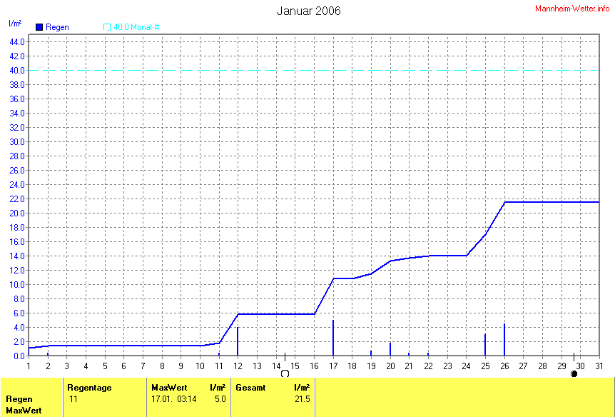 Die gesamte Regenmenge lag bei 21.5l/m² (entspricht: 53.8%) und war damit um -18.5l/m² vom langjährigen Wert entfernt. Niederschlag gab es an 11Tagen. Mehr als 2mm Regen gab es an 4Tagen. Sehr viel Regen mit mehr als 20mm pro Tag gab es an 0Tagen.