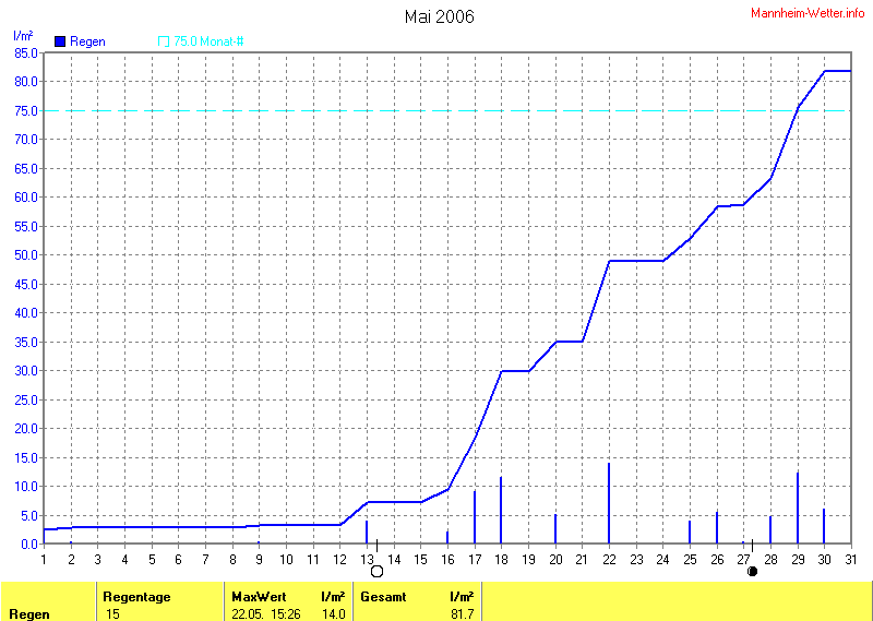 Die Durchschnittstemperatur für den Monat Mai 2006 lag bei 16.03°C. Die Abweichung vom langjährigen Mittel war +1.63°C.
