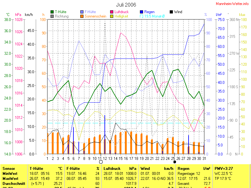 Der wärmste Tag war der 26.07.2006 um 15:49 mit 37.2°C. Am kältesten war es mit 15.5°C am 18.07.2006 um 05:16.