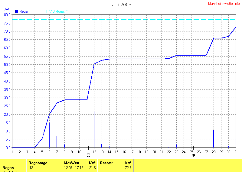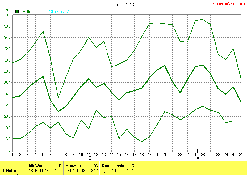 Die Durchschnittstemperatur für den Monat Juli 2006 lag bei 25.22°C. Die Abweichung vom langjährigen Mittel war +5.72°C.