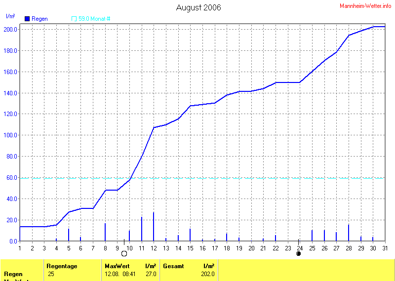 Die gesamte Regenmenge lag bei 202.0l/m² (entspricht: 342.4%) und war damit um +143.0l/m² vom langjährigen Wert entfernt. Niederschlag gab es an 25Tagen. Mehr als 2mm Regen gab es an 21Tagen. Sehr viel Regen mit mehr als 20mm pro Tag gab es an 2Tagen.