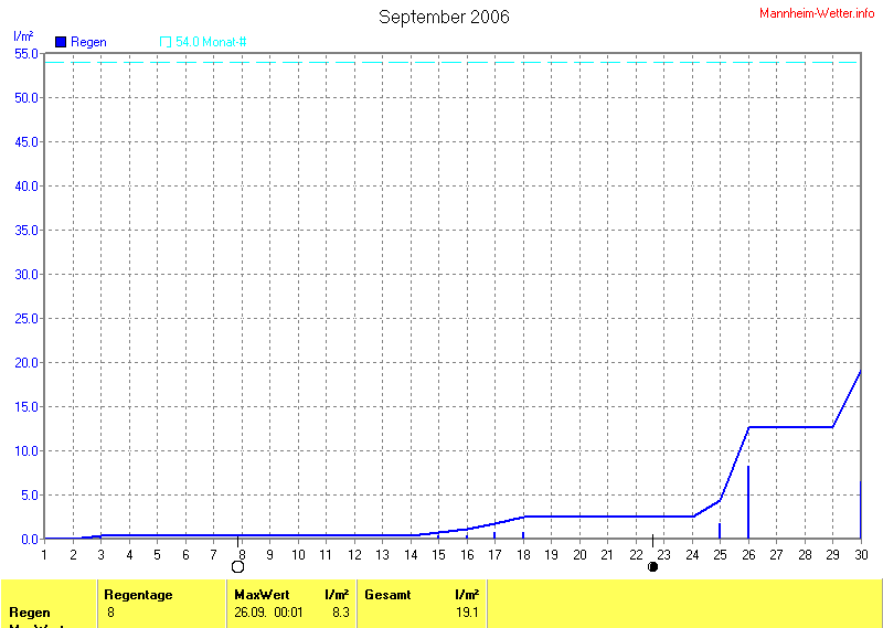 Die gesamte Regenmenge lag bei 19.1l/m² (entspricht: 35.3%) und war damit um -34.9l/m² vom langjährigen Wert entfernt. Niederschlag gab es an 8Tagen. Mehr als 2mm Regen gab es an 2Tagen. Sehr viel Regen mit mehr als 20mm pro Tag gab es an 0Tagen.