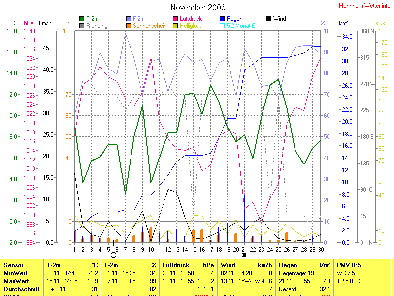 Der wärmste Tag war der 15.11.2006 um 14:35 mit 16.9°C. Am kältesten war es mit -1.2°C am 02.11.2006 um 07:40.