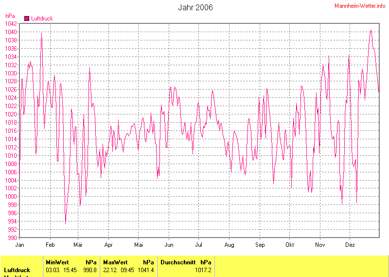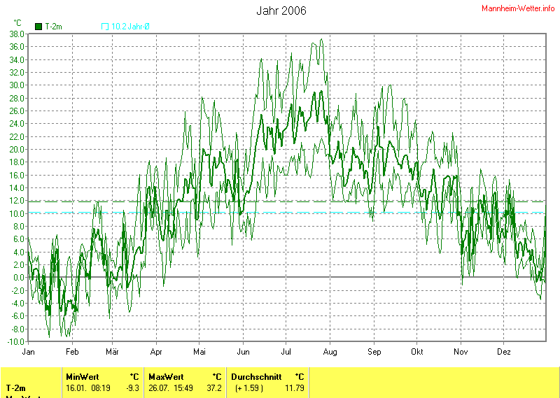 Die Durchschnittstemperatur für das Jahr 2006 lag bei 11.79°C. Die Abweichung vom langjährigen Mittel war +1.59°C.
