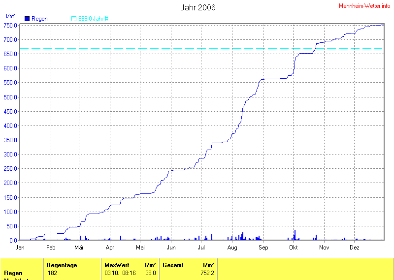 Die gesamte Regenmenge lag bei 752.5l/m² ( 112.5%) und war damit um +83.5l/m² vom langjährigen Wert entfernt. Niederschlag gab es an 183Tagen. Mehr als 2mm Regen gab es an 90Tagen. Sehr viel Regen mit mehr als 20mm pro Tag gab es an 4Tagen.