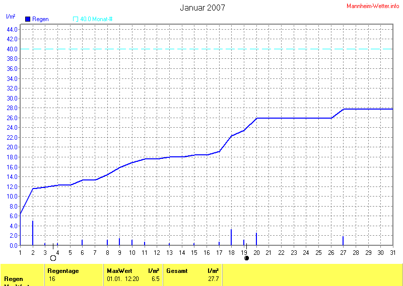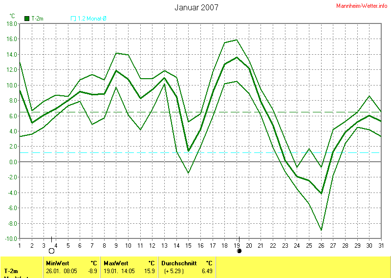 Der wärmste Tag war der 19.01.2007 um 14:05 mit 15.9°C. Am kältesten war es mit -8.9°C am 26.01.2007 um 08:05.