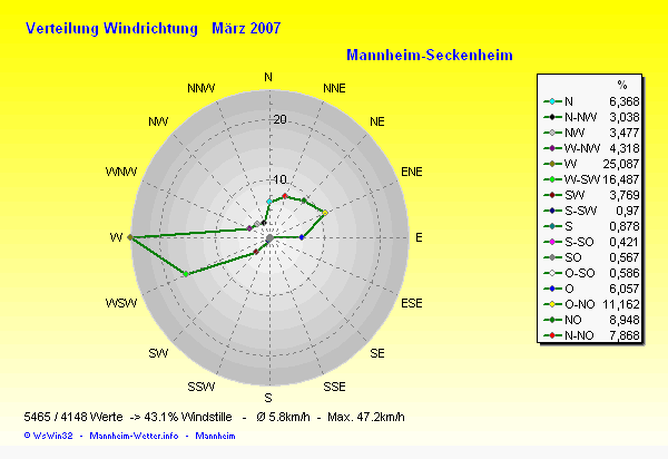 Die Durchschnittstemperatur für den Monat März 2007 lag bei 7.98°C. Die Abweichung vom langjährigen Mittel war +2.08°C.