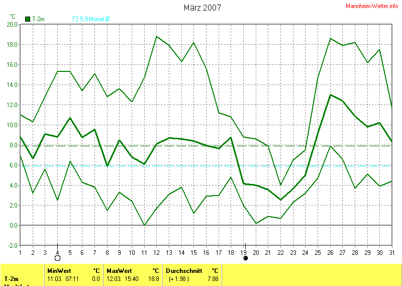 Der wärmste Tag war der 12.03.2007 um 15:40 mit 18.8°C. Am kältesten war es mit 0.0°C am 11.03.2007 um 07:11.