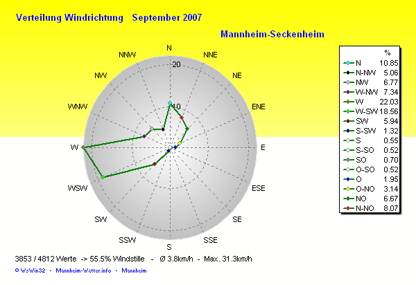 Die Durchschnittstemperatur für den Monat September 2007 lag bei 14.17°C. Die Abweichung vom langjährigen Mittel war -1.13°C.