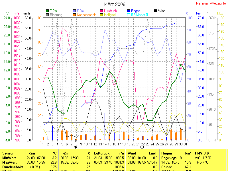 Der wärmste Tag war der 30.03.2008 um 15:35 mit 22.9°C. Am kältesten war es mit -3.2°C am 24.03.2008 um 07:00.