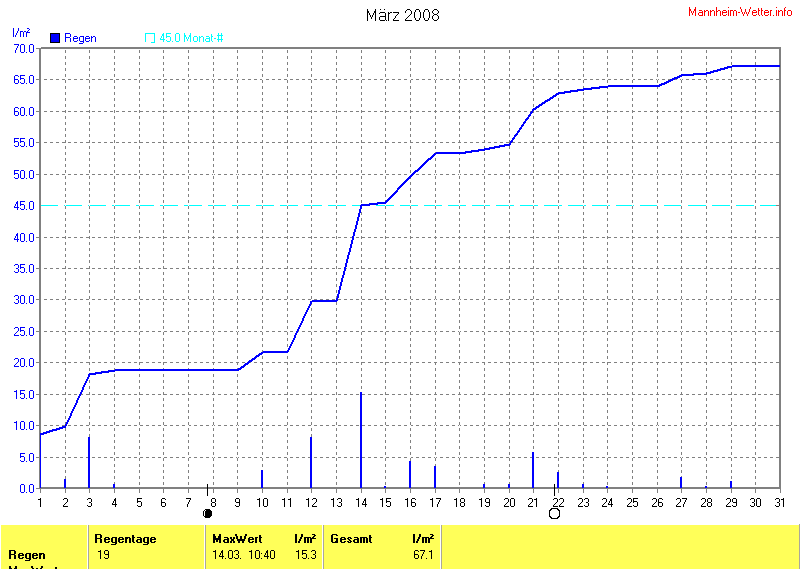 Die gesamte Regenmenge lag bei 67.1l/m² (entspricht: 149.1%) und war damit um +22.1l/m² vom langjährigen Wert entfernt. Niederschlag gab es an 19Tagen. Mehr als 2mm Regen gab es an 9Tagen. Sehr viel Regen mit mehr als 20mm pro Tag gab es an 0Tagen.