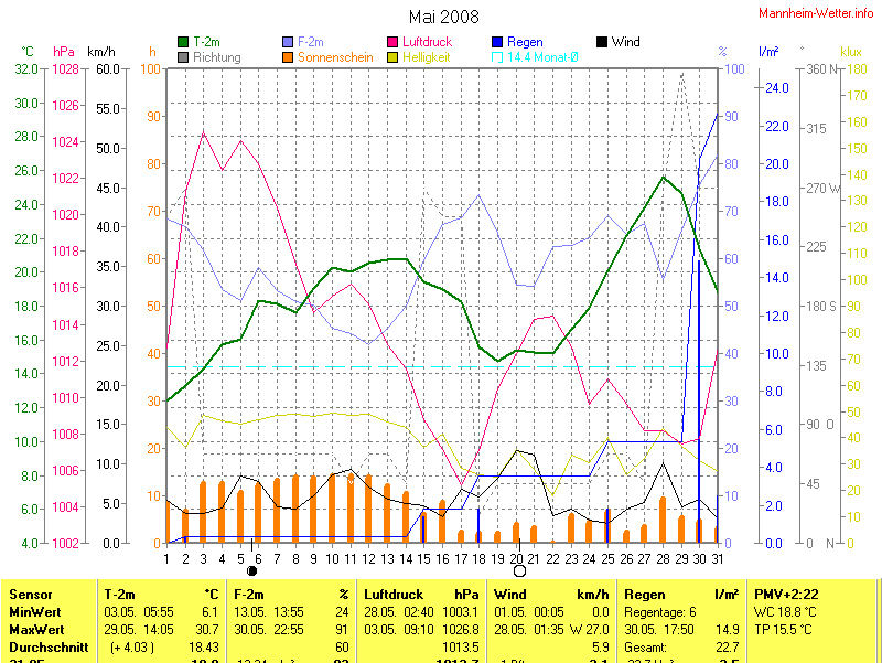 Die Durchschnittstemperatur für den Monat Mai 2008 lag bei 18.43°C. Die Abweichung vom langjährigen Mittel war +4.03°C.