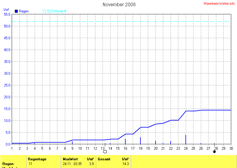 Dargestellt wird die grafische Übersicht für den Niederschlag. Zu sehen sind immer die täglichen Niederschlagsmengen (von 0-24 Uhr) und in der ansteigenden Linie die Summe aller Niederschläge: